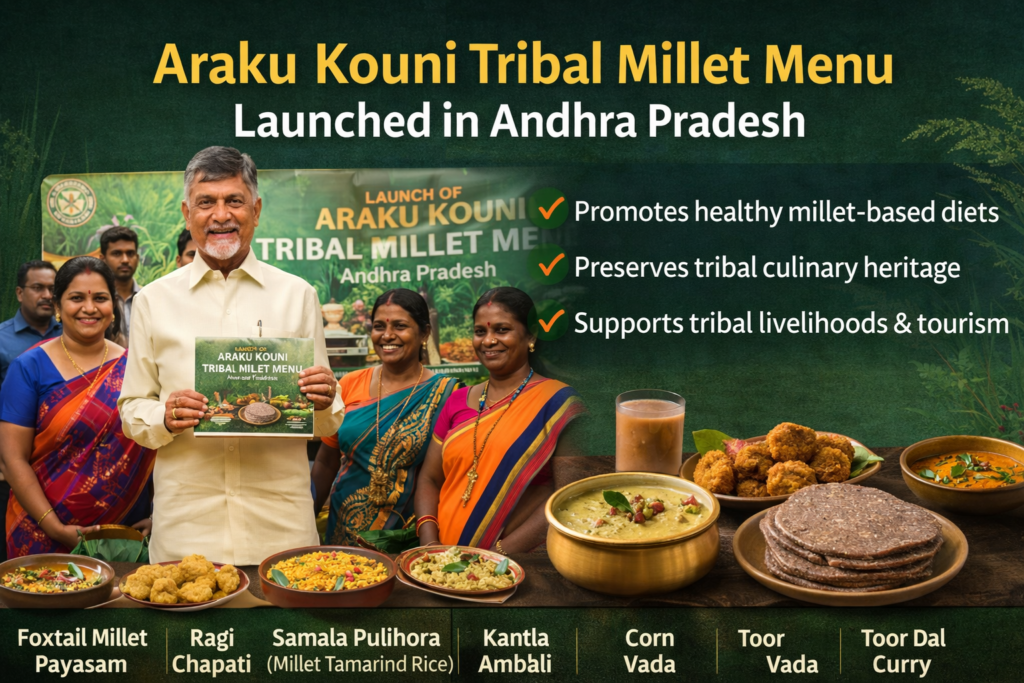 Andhra Pradesh Chief Minister N. Chandrababu Naidu has launched “Araku Kouni”, the state’s first tribal millet‑based food menu, highlighting traditional tribal cuisine and promoting healthy eating habits. The launch took place during a District Collectors’ Conference in Vijayawada, where Naidu unveiled the meal concept developed from authentic tribal recipes.
